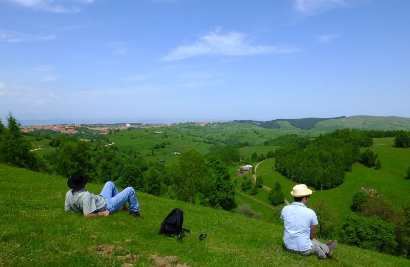 We are climbing in altitude and we reach the beautiful village of Jina (maybe we bought the beer here) where Daniel parks the car because we are going to walk to the sheepfold from here. That means all the produce Daniel purchased has to be carried to the family’s’ farm which Daniel assures us isn’t too far away. Paul places two bottles of beer in his daypack (they are 1 liter each) along with our water, plus he is able to put a couple other items that Daniel bought in the pack. That leaves Daniel carrying two heavily laden sacks while I am given responsibility for the bag of strawberries.