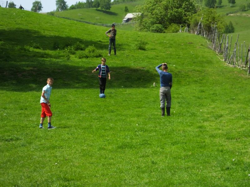 Upon our return to the sheepfold, Gabi and Nicu, are in a game of soccer with two other boys. Gabi and Nicu are playing in their rubber boots and it is amazing how they can manipulate the soccer ball despite the awkward footwear. Ileana is milking the one cow that has a calf, the other three cows are not far from calving. We go out to take a look and are surprised to see the baby calf is nursing one side while Ileana is milking out the other side of the cow. That certainly saves time.