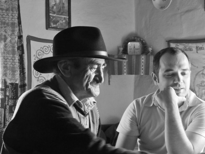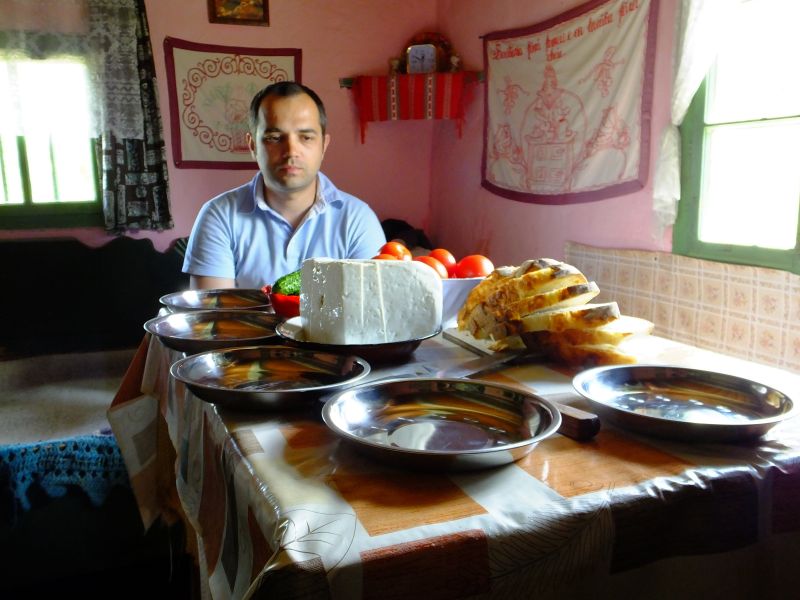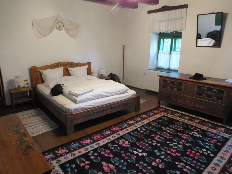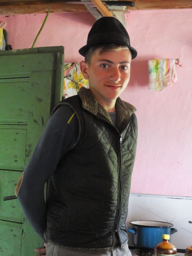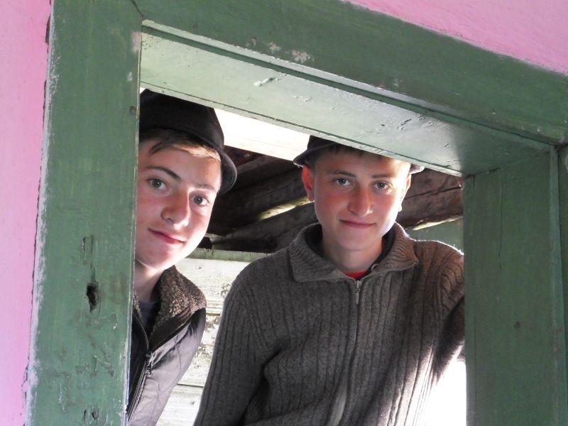 Paul and I estimate we have walked about two miles as we approach the family abode. We turn left off the main road onto a less traveled track where the shepherds property is located. We happen to meet a neighbor at this point and he tells us the family has moved to their other property for the summer. Luckily the other place is across the road and not much farther to walk. It isn’t long before we reach the gate that leads into the sheepherder’s property and we walk through the pasture to the tiny cabin that the family calls home. Ileana (yep, the same name as the woman at the guesthouse) and Dinu welcome us and invite us into their one room house. The couple’s handsome teenage boys, Gabi and Nicu, appear at the door and look curiously at the foreigners who have come to visit. (I hope I have the names right but someone’s writing is a bit hard to make out).