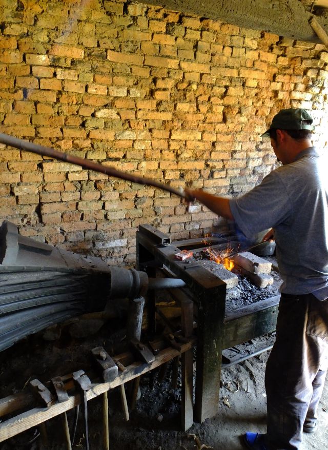 This morning, Paul and I go down to the courtyard and sit on the bench in front of the main house. Paul is checking on emails and I am admiring the unique ways that Dorin and Ileana have planted flowers in old antiques. We go into breakfast at eight and Dorin serves cheese, bread along with an eggplant spread, juice and of course tea. Ileanna has already left for work so Dorin is in charge of our breakfast.