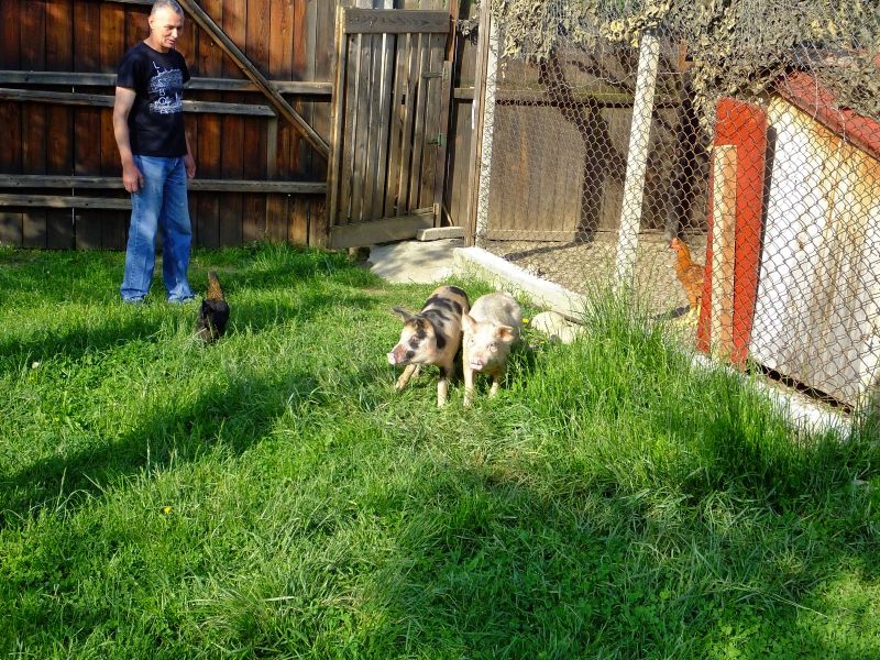 After we have eaten, the four of us go to the area behind the house and look at the large garden where various kinds of vegetables are being grown. There is a fence between the garden and a grassy area. Here Dorin keeps two sheep, two pigs and a small flock of chickens. Dorin turns the chickens and pigs out of their pens and the pigs happy to be free, go for a gallop around the grassy lot. The sheep are too busy eating grain to pay attention to us.