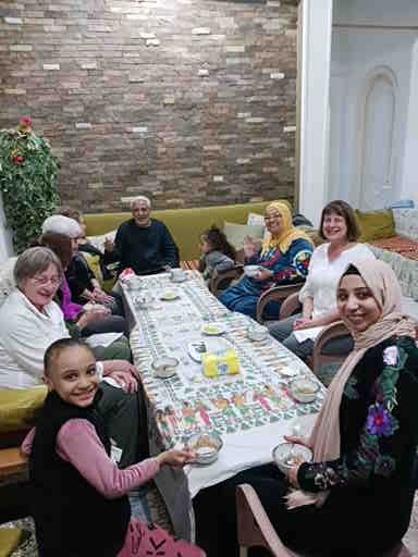 The bus stops and lets us off at a side street where we follow Hussein down the dark, narrow street to our host’s house. A man is waiting for us, and he raises his hand while calling out a greeting to Hussein and our group. We follow our host into his house where Hussein introduces everyone. Hussein then leaves after telling our group that he will return later this evening to accompany us back to the coach.