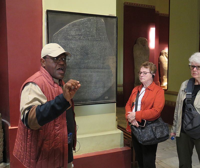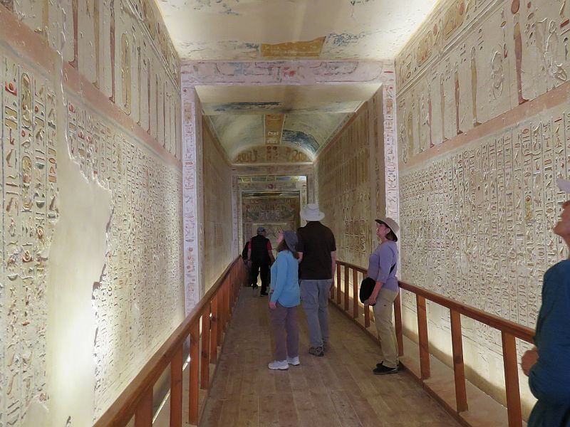 When we reach the tombs, we form a half-circle around Hussein, who talks about the history of Valley of the Kings. Hussein also gives us useful information at the entrance of each individual tomb we are visiting and describes specific scenes or figures to look for among the paintings on the tomb walls. The tomb of Ramses IV is included with the ticket that allows you entrance to the Valley of the Kings. King Tutankhamen’s tomb is included with our OAT package. Hussein has personally purchased the ticket for Ramses VI tomb for us as he insists, we must experience, what in his opinion, is the most spectacular tomb in the Valley. How kind and generous is that?