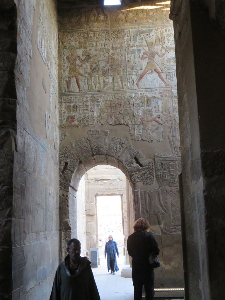 Ramses VI tomb is our last stop, and we enjoy more history given to us by our excellent guide. As we begin walking down the long tunnel to Ramses VI tomb the depictions on the walls and ceiling are overwhelming. The deeper we get the more vivid the colors are. It is on this walk that I see a member of our group point out a very odd figure and says something about aliens which causes his wife to snort with derision. I speak up and admit that I do not discount the alien or otherworldly theory many people have, which makes her throw up her hands in exasperation. My open-minded friend and I continue talking about the possibility of alien influence or help building these structures throughout our trip, much to the hilarity of the rest of our group including Hussein. Yeah, we both watch Ancient Aliens on the History Channel, but my doubts started long before I began to watch that show. After Paul and my visit to Peru and Machu Pichu, I wondered about the ability of these ancient people being able to build such structures with only stone hammers and copper tools. Just saying.