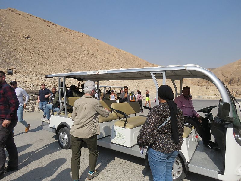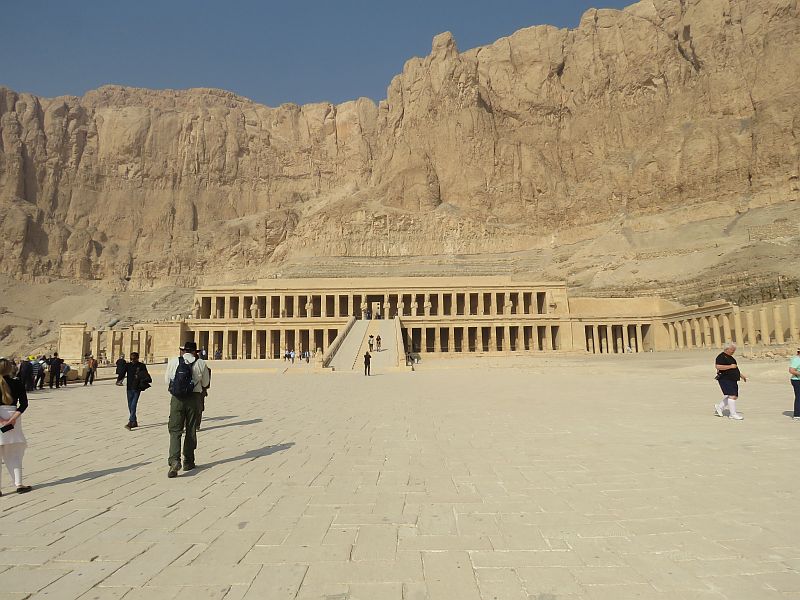 We are off to explore the Valley of the Kings this morning. We board a motorboat that takes us across the Nile to where a bus awaits us. Our first stop is at the Mortuary Temple for Queen Hatshepsut. All visitors must walk through the vendor tent in order to get to the ticket office. Oh my gosh, the people are very persistent and aggressive. Hussein stops at one stall and shows us the things he would recommend buying here if one is interested and then tells us what we should pay for these items. Hussein reminds us that you must bargain, it is expected. We finally reach the ticket office, after listening to the phrase “only one dollar” being shouted at us as we walk the length of the souvenir filled tent. Hussein hands us our tickets and points out the location of the restroom, which several of us take advantage of before we proceed. Have I mentioned that you must pay five Egyptian pounds to use a public restroom? This is equivalent to around 15 cents. When our group is all accounted for, we climb into carts and the driver takes us the short distance to Queen Hatshepsut’s Mortuary Temple.
