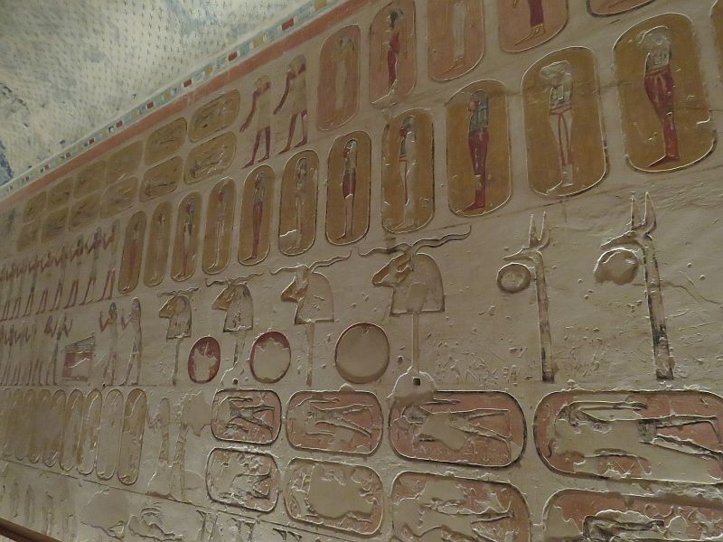 The number of people allowed into the tombs is limited, and rightly so as the area in the tunnel and tomb is not that spacious. We descend a staircase that takes us to Ramses IVs’ tomb. As we walk through the hallway we gaze at the painted scenes and hieroglyphs that cover the walls on both sides. We occasionally stop and admire a particular scene or figure. It is hard to fathom the work and time it took to carve this tomb out of the rock and to paint or carve all the scenes and figures that plaster every inch of the rock walls. What we are looking at is awesome. It is hard to imagine that Ramses VI’s tomb could surpass what we are experiencing in this tomb!