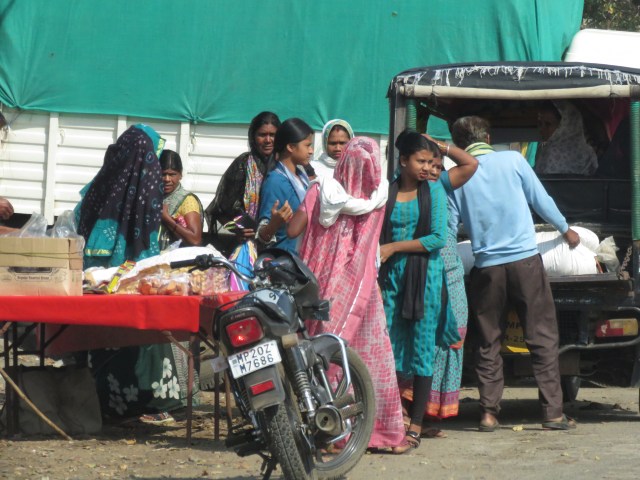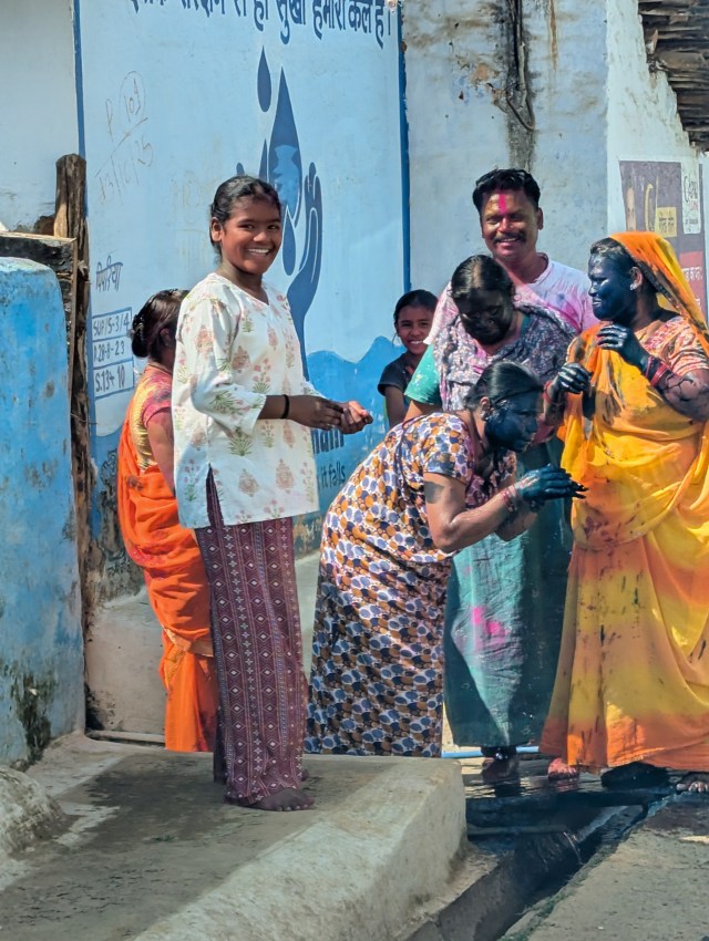 Joy, Paul, and I walk over to one of the SUV’s and lay claim to it. The driver’s name is Bonsei. He is a very nice man, with limited English. He proves to be a good driver, and he doesn’t excessively use his horn. On our four hour drive we pass through many villages even more colorful than usual since the people are celebrating Holi which is a Hindu festival celebrating color, love and springtime. I looked that up😊. One of the ways they celebrate is painting their faces with various colors and splashing each other with paint. We even see some dogs that have joined the celebration whether they wanted to or not, their coats splashed with red or blue paint. For some reason I did not capture any of the villagers that were covered in paint, but Paul did get one great photo with his phone.