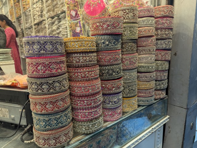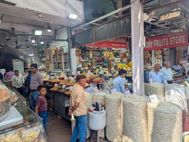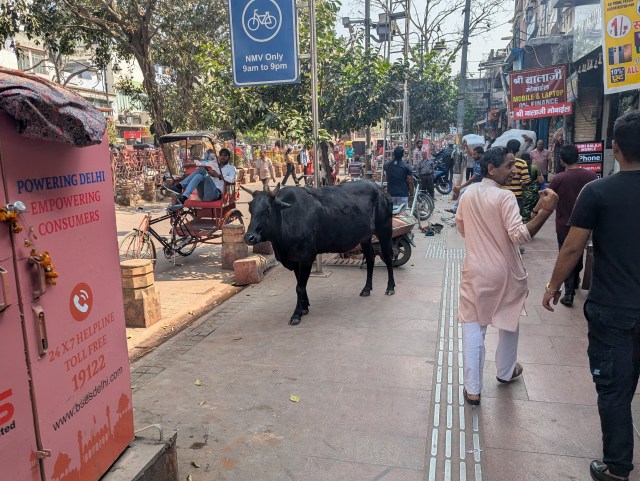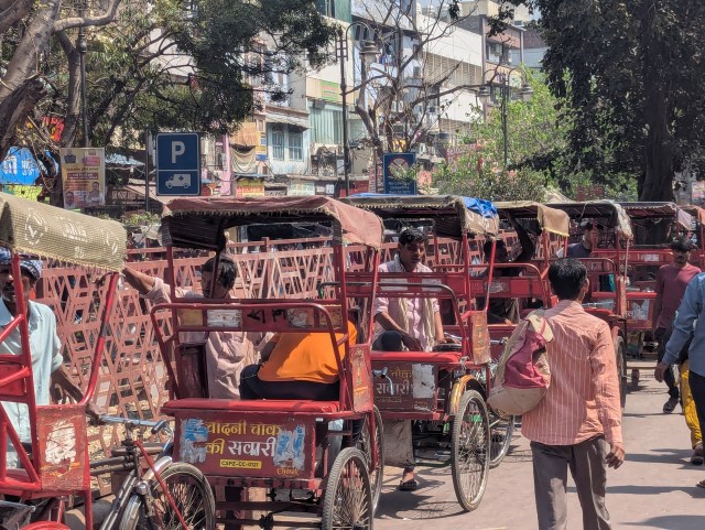 We exit the rickshaw after a few blocks, and we now wait for our guide to choose a motorized cart. I guess he wants us to experience various types of transportation in Old Delhi. Several people are trying to get his attention, but he chooses an older man, and we climb into the cart which comfortably holds four people. Our driver takes off and joins the throng of traffic consisting of cars, rickshaws, tuk-tuks, motorcycles, and humans. Geez. Our guide warns us to keep our arms and hands inside the cart as there is little wiggle room between all the modes of traffic clogging the street.