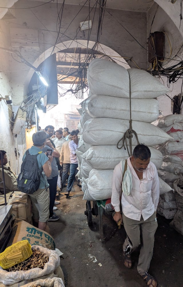 Our guide leads us to a large area where men are unloading and moving bags of spices. He warns us that we will walk through the spice area until we are overcome with sneezing and coughing. I think he is joking but he definitely was not! After a few minutes we are all beginning to clear our throats along with coughing on occasion. Our guide takes us down another alley and we are happy to leave the spice saturated air behind. I can’t imagine having to work in that place all day long. You have to wonder what state those workers lungs are in.