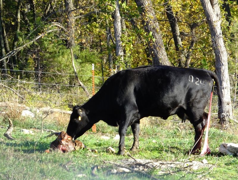 There is a happy ending to this story as sometime in the night 298 has decided that this is her calf after all. When Paul and I check them in the morning the calf has nursed and 298 is uttering some motherly sounds towards her. In another day 298 has turned into a protective, loving mother, and on the third day we turn the happy pair with the herd that is on the Rock place.